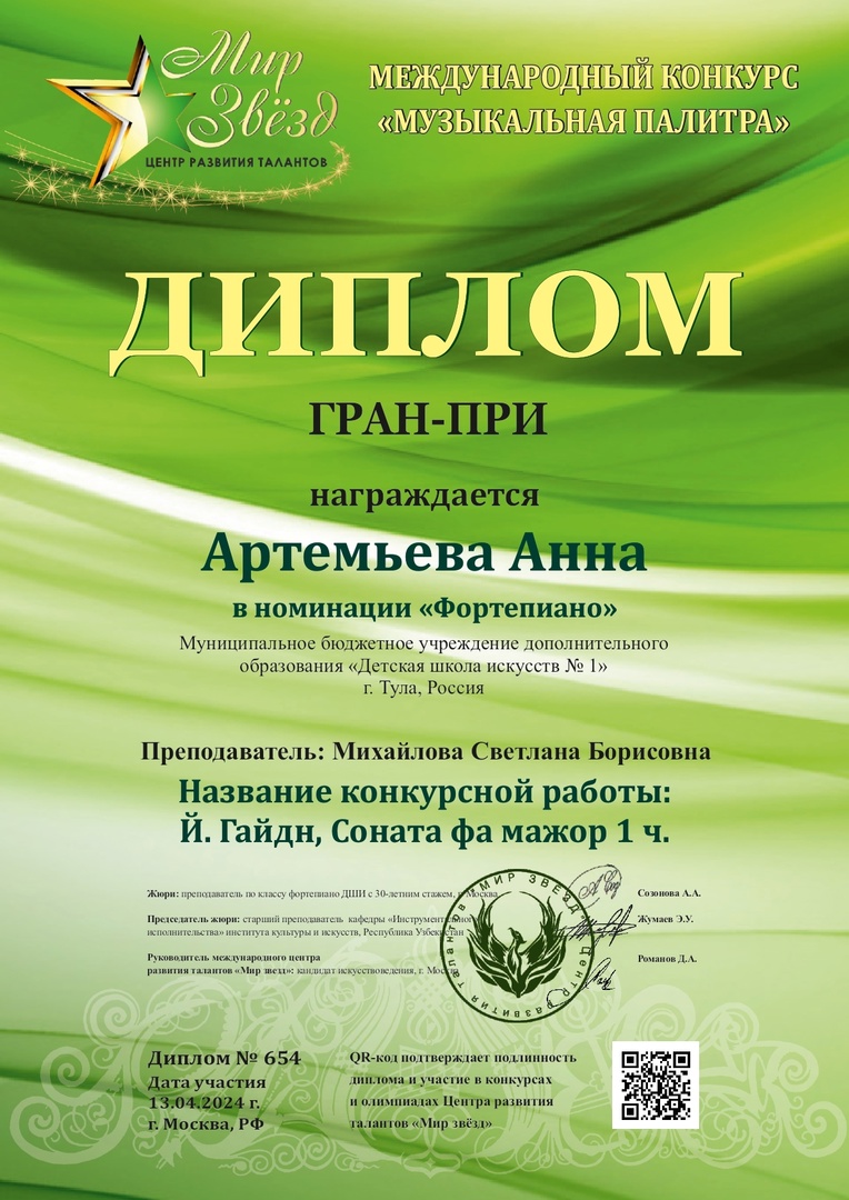 ПОЗДРАВЛЯЕМ обладателя ГРАН-ПРИ Международного конкурса "Музыкальная палитра" Артемьеву Анну