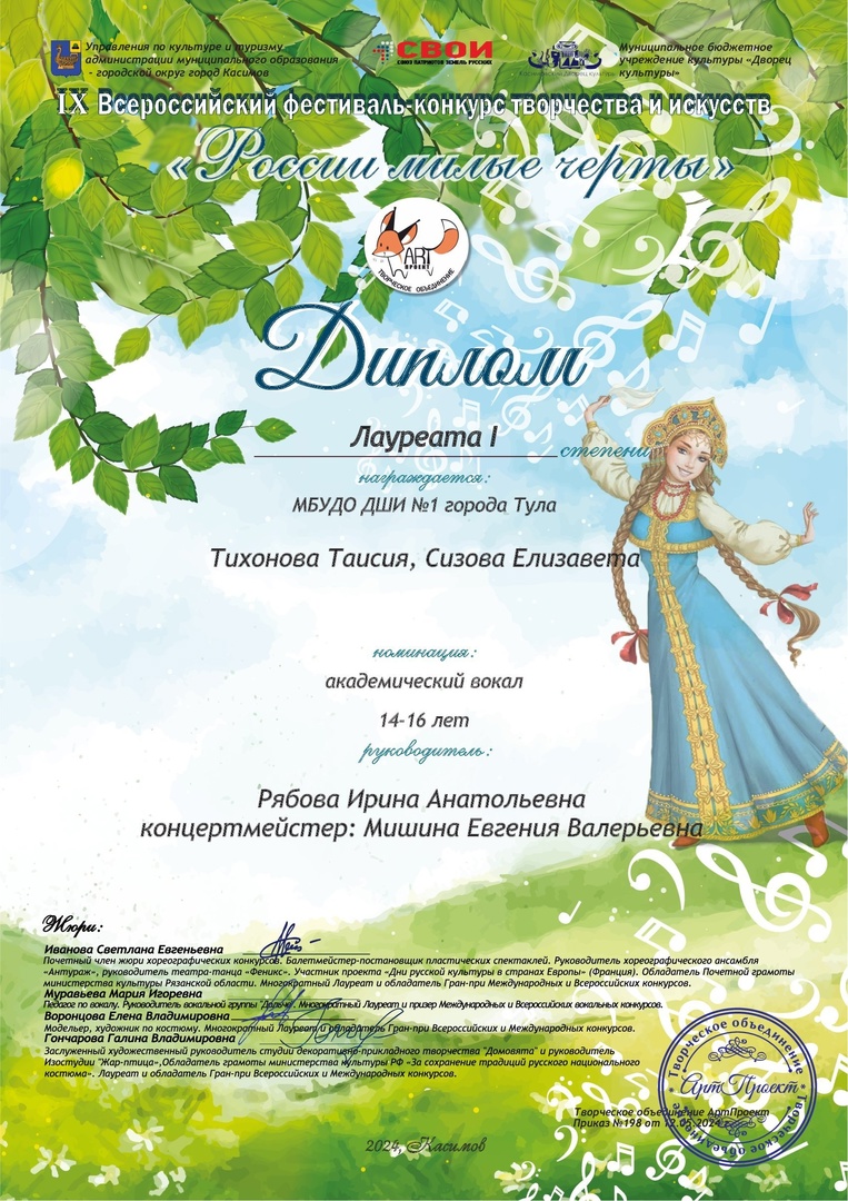 29 мая 2024, Среда 11:05 Просмотров: 591Поздравляем ПОБЕДИТЕЛЕЙ IX Всероссийского конкурса творчества и искусств «России милые черты» учащихся класса Ирины Анатольевны Рябовой, концертмейстер Евгения Валерьевна Мишина