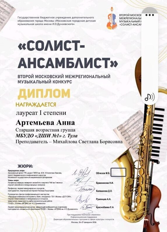 ПОЗДРАВЛЯЕМ победителей Второго московского межрегионального музыкального конкурса "СОЛИСТ-АНСАМБЛИСТ"! Артемьева Анна, преподаватель Михайлова С.Б - лауреат I степени;