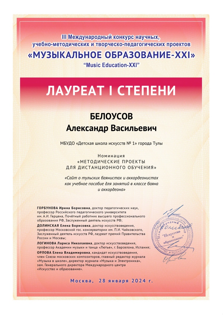 Проект Александра Васильевича удостоен диплома Лауреата I степени. Работу Белоусова А.В. «Сайт о тульских баянистах и аккордеонистах как учебное пособие для занятий в классе баяна и аккордеона» планируется опубликовать в будущих номерах журнала «Музыка в школе».
