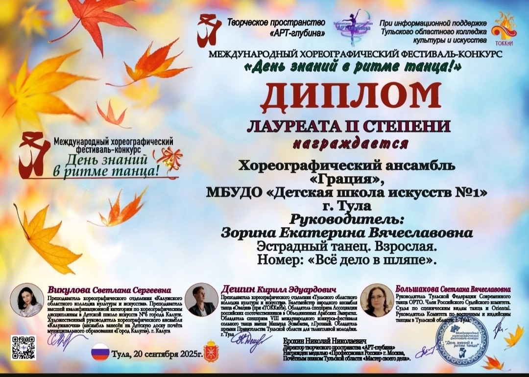 30 сентября 2025, Вторник 12:09 Просмотров: 165Поздравляем с прекрасными результатами - дважды лауреат 2 степени, участниц хореографического ансамбля "Грация" в международном хореографическом он-лайн конкурсе "День знаний в ритме танца!".