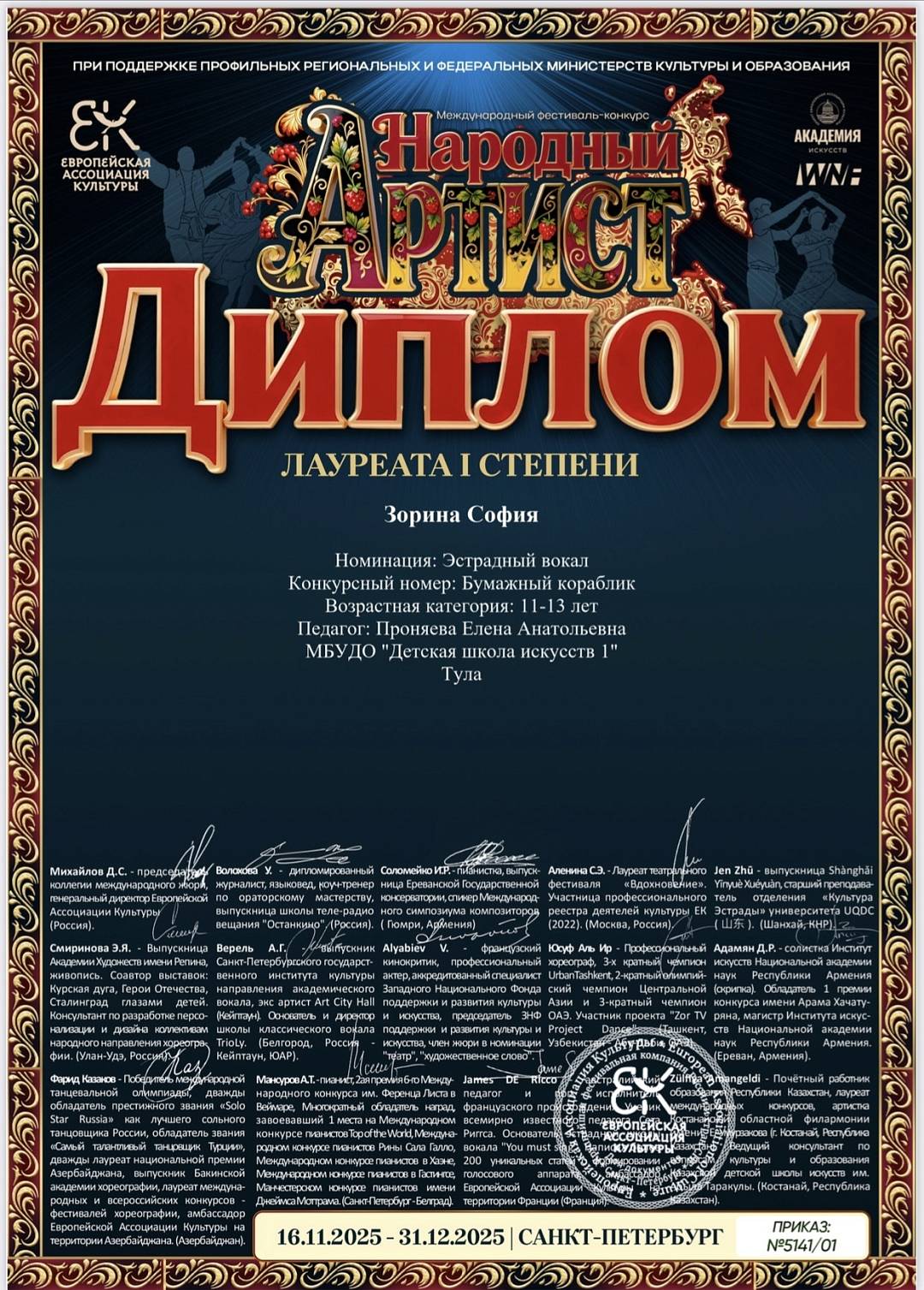 Поздравляем Софию Зорину - лауреата 1 степени Международного конкурса «Народный артист»!