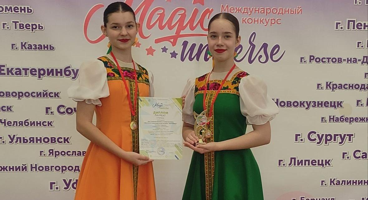 28 октября 2025, Вторник 12:10 Просмотров: 136Поздравляем солисток образцового хореографического ансамбля "Вдохновение" Толмачеву Валерию и Гузееву Екатерину с прекрасным выступлением на Международном конкурсе "Magic universe" и с дипломом Лауреата 1 степени.
