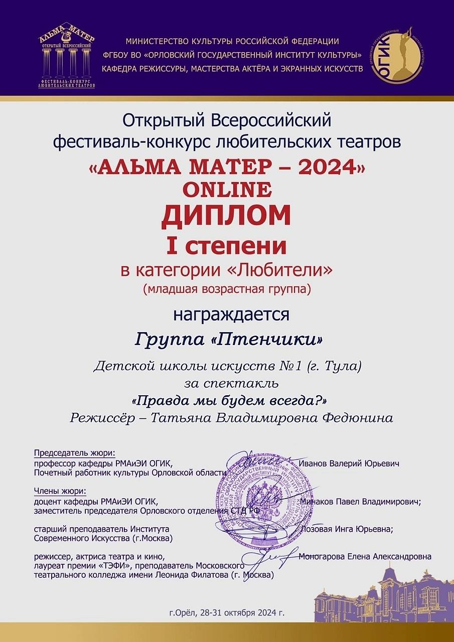 7 ноября 2024, Четверг 03:11 Просмотров: 461ПОЗДРАВЛЯЕМ театральную группу «Птенчики» Образцового коллектива ДМТ «Синяя птица» и их руководителя Татьяну Владимировну Федюнину - Дипломантов I степени Всероссийского фестиваля любительских театров «Альма Матер-2024».