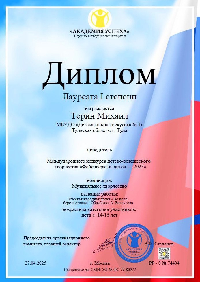 6 мая 2025, Вторник 12:05 Просмотров: 393Поздравляем Терина Михаила (класс баяна преподавателя А.В. Белоусова), ставшего лауреатом I степени Международного детско-юношеского конкурса «Фейерверк талантов – 2025»!