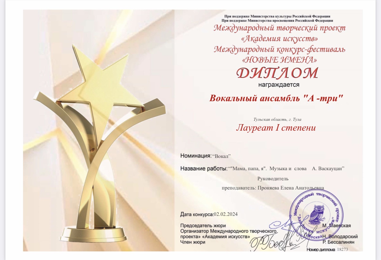 Поздравляем вокальный ансамбль «А- три» (руководитель Елена Анатольевна Проняева) с Дипломом лауреата 1 степени Международного конкурса- фестиваля «Новые имена»!