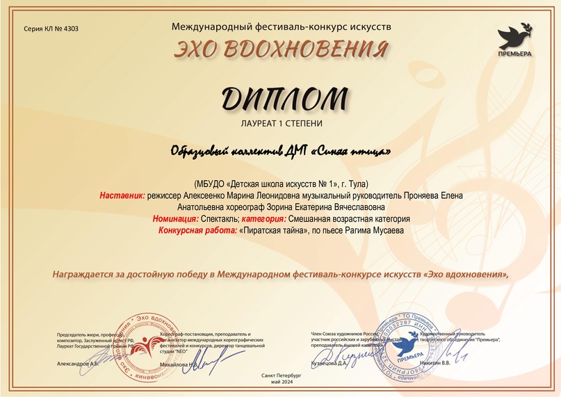 29 мая 2024, Среда 11:05 Просмотров: 649Поздравляем юных артистов образцовых коллективов ДМТ "Синяя птица" и хореографического ансамбля "Вдохновение" - всех, кто принимал участие в постановке спектакля "Пиратская тайна" (автор сценария Рагим Мусаев, режиссер Марина Леонидовна Алексеенко, музыкальный руководитель Проняева Елена Анатольевна, хореограф Екатерина Вячеславовна Зорина) с Дипломом лауреата I степени Международного фестиваля-конкурса "Эхо вдохновения"!