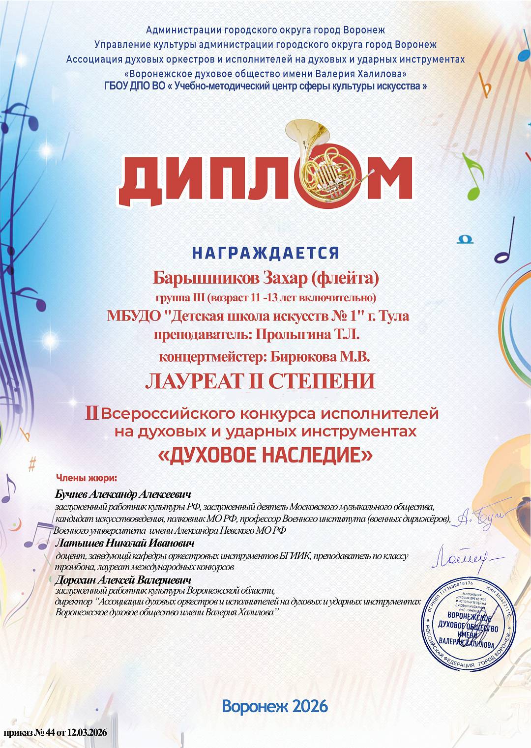 13 апреля 2026, Понедельник 12:04 Просмотров: 4Поздравляем Захара Барышникова, преподаватель Пролыгина Татьяна Львовна, концертмейстер Бирюкова Марина Викторовна, с Дипломом лауреата II степени II Всероссийского конкурса исполнителей на духовых и ударных инструментах «Духовое наследие» (г.Воронеж).