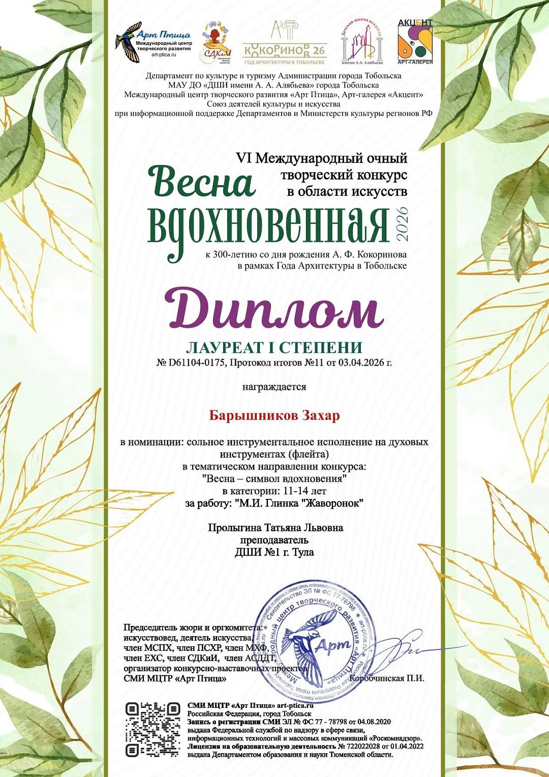 13 апреля 2026, Понедельник 12:04 Просмотров: 13Поздравляем Захара Барышникова, преподаватель Пролыгина Татьяна Львовна, концертмейстер Бирюкова Марина Викторовна, с двумя дипломами Лауреата I степени VI Международного очного творческого конкурса в области искусств «Весна вдохновенная» к 300-летию со дня рождения А.Ф. Кокоринова в рамках Года Архитектуры в Тобольске.