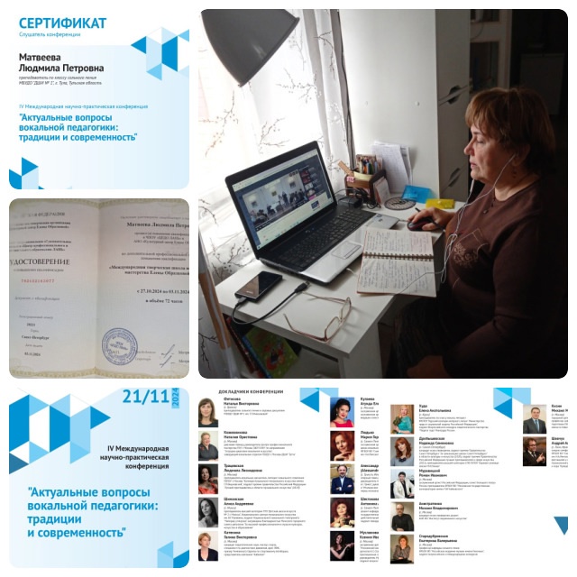 16 декабря 2024, Понедельник 11:12 Просмотров: 398Преподаватель нашей школы Людмила Петровна Матвеева прошла повышение квалификации в Международной творческой школе вокального мастерства Елены Образцовой (заочно) и приняла участие в работе IV Международной научно-практической конференции "Актуальные вопросы вокальной педагогики: традиции и современность".