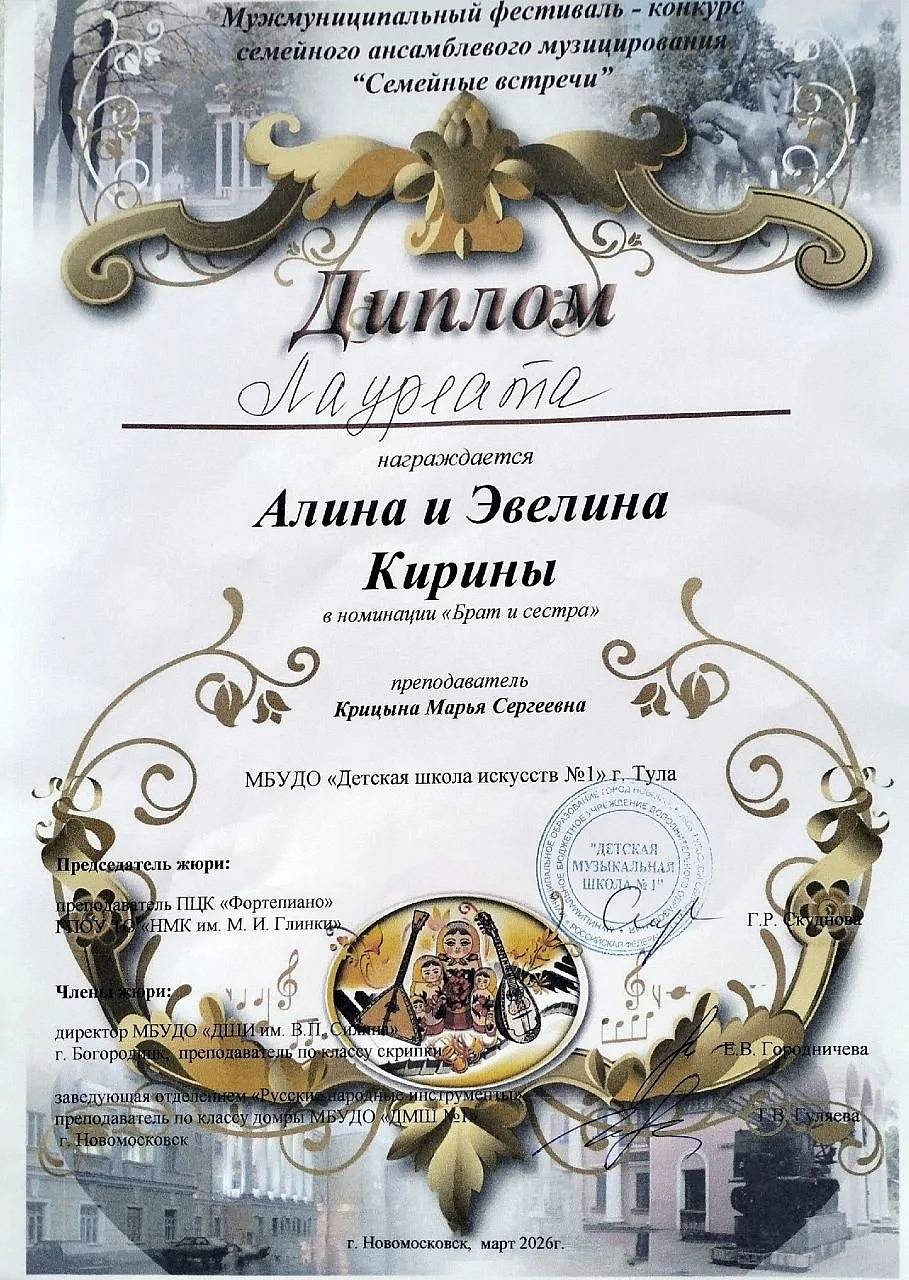 27 марта 2026, Пятница 12:03 Просмотров: 1414 марта в г.Новомосковск проходил Межмуниципальный фестиваль-конкурс ансамблевого семейного музицирования "Семейные встречи". Учащиеся нашей школы сестры Алина и Эвелина Кирины (преп. Крицына М.С.) стали ЛАУРЕАТАМИ конкурса!