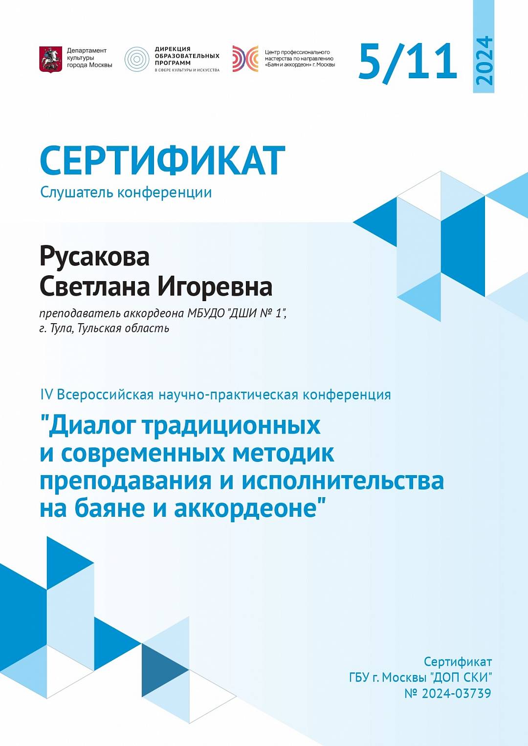 15 ноября 2024, Пятница 10:11 Просмотров: 5075 ноября преподаватель нашей школы Светлана Игоревна Русакова приняла участие в IV Всероссийской научно-практической конференции "Диалог традиционных и современных методик преподавания и исполнительства на баяне и аккордеоне"