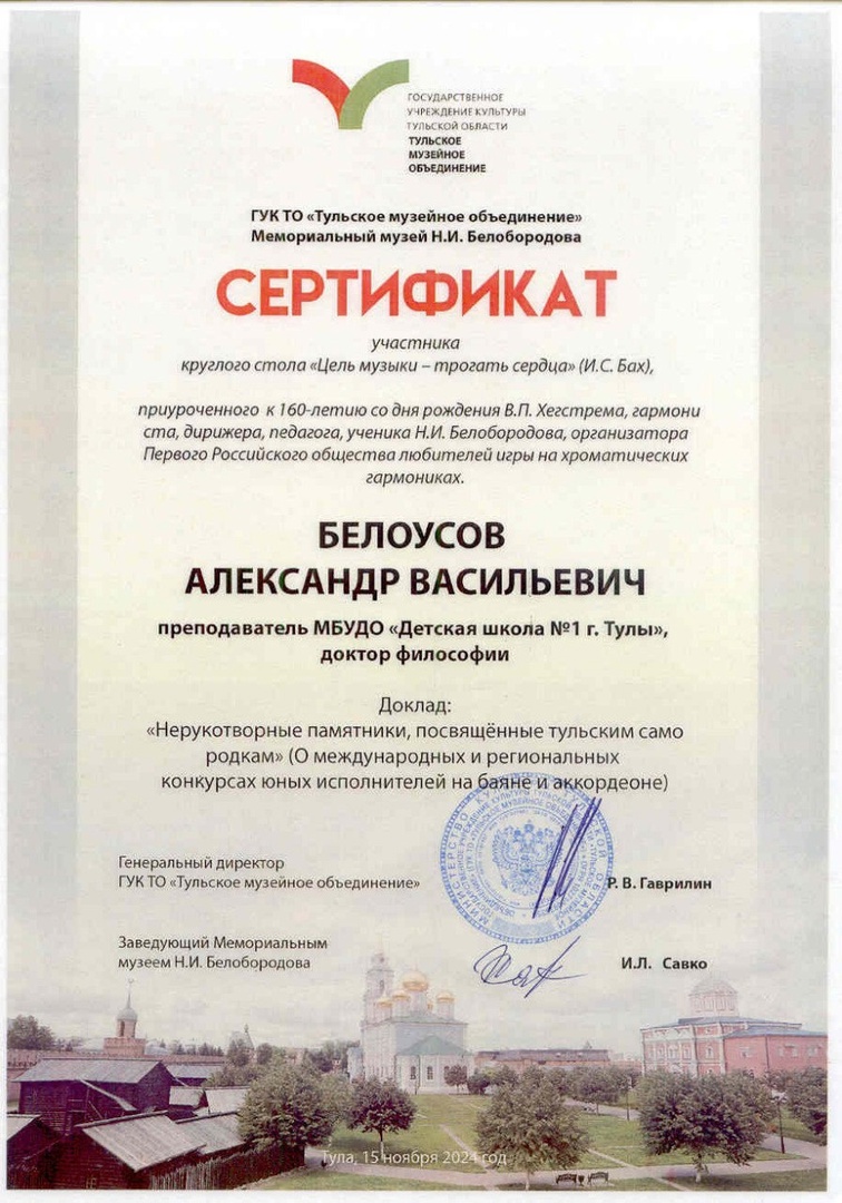 19 ноября 2024, Вторник 10:11 Просмотров: 40915 ноября 2024 года в мемориальном музее Н.И. Белобородова прошел круглый стол «Цель музыки – трогать сердца», приуроченный к 160-летию гармониста, баяниста, дирижера, лучшего ученика Н.И. Белобородова, организатора Первого Российского общества любителей игры на хроматических гармониках, пропагандиста баянной культуры Владимира Петровича Хегстрема.