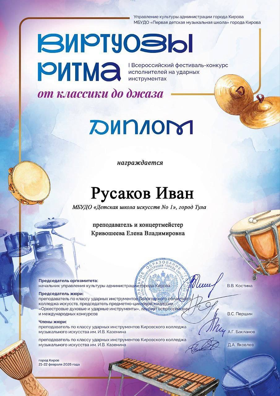 Поздравляем с успешным выступлением на I Всероссийском фестивале - конкурсе исполнителей на ударных инструментах «ВИРТУОЗЫ РИТМА: от классики до джаза» (г.Киров) учащихся класса преподавателя Кривошеевой Е.В., концертмейстеры Кривошеева Е.В., Косолапова Т.Ю., ансамбль «Ритмы времени» (Ананьева Арина, преп. Дагаева И.Л.; Бригадиров Лев, преп. Попова И.В.; Кривошеев Владислав).