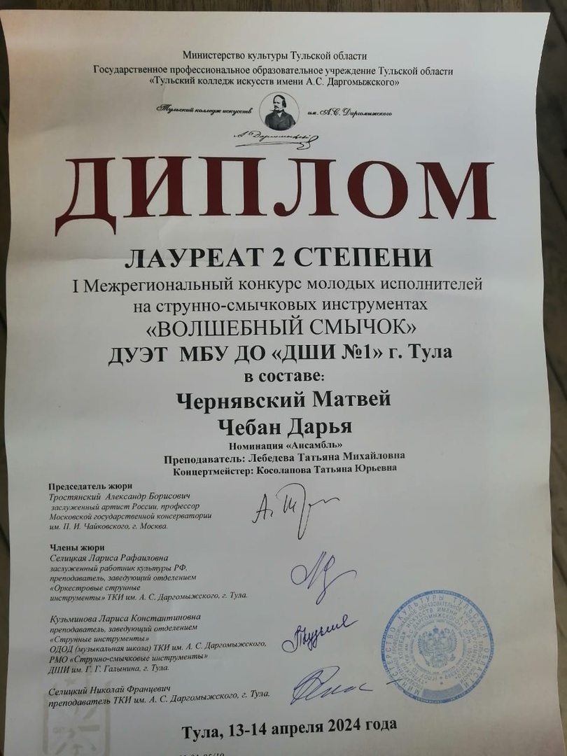 23 апреля 2024, Вторник 12:04 Просмотров: 735Поздравляем ПОБЕДИТЕЛЕЙ I Межрегионального конкурса молодых исполнителей на струнно-смычковых инструментах «ВОЛШЕБНЫЙ СМЫЧОК»!