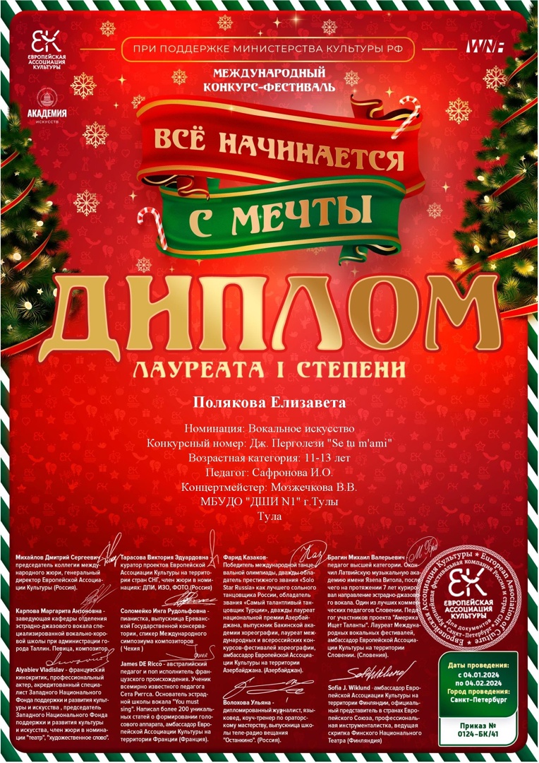Поздравляем преподавателя нашей школы Ирину Олеговну Сафронову и её ученицу Елизавету Полякову (концертмейстер Вера Викторовна Мозжечкова) с Дипломами лауреатов I степени Международного конкурса-фестиваля "Всё начинается с мечты"!