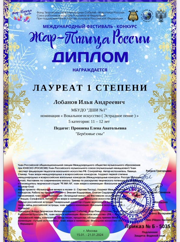 Поздравляем Илью Лобанова (преподаватель Елена Анатольевна Проняева и Ирина Витольдовна Попова) с Дипломами лауреата 1 степени Международного фестиваля- конкурса «Жар- Птица России»!