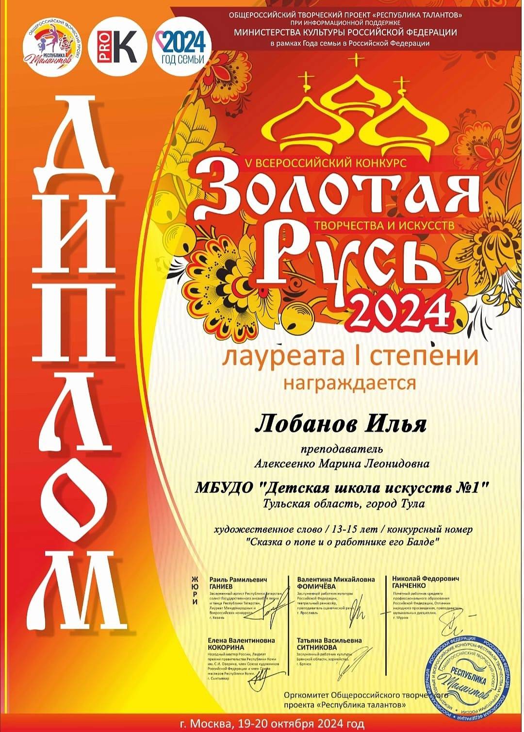 Поздравляем Илью Лобанова, преподаватель Марина Леонидовна Алексеенко, с ПОБЕДОЙ (Диплом лауреата I степени) V Всероссийского конкурса творчества и искусств "Золотая Русь 2024"!