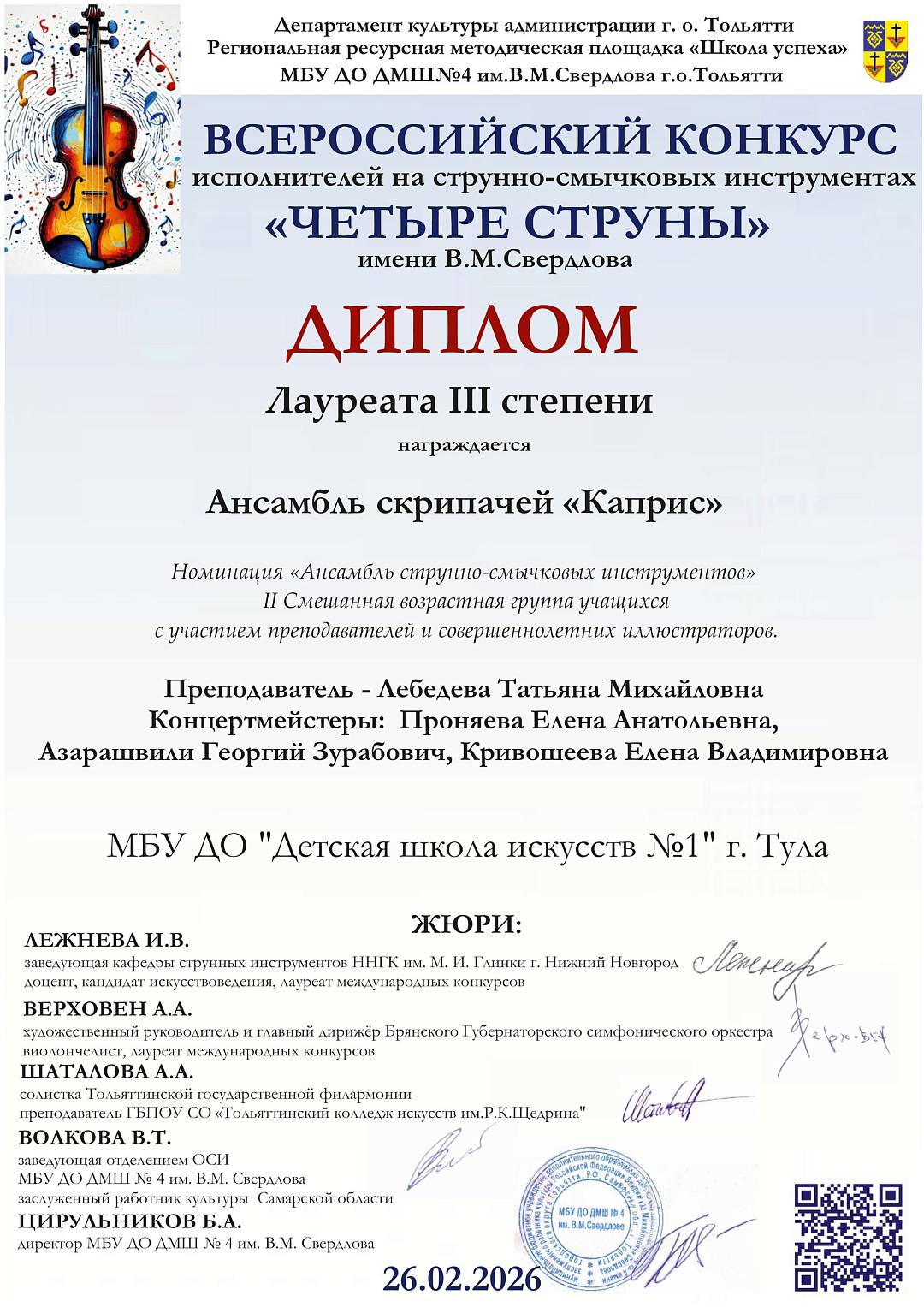 Поздравляем ПОБЕДИТЕЛЯ (Диплом лауреата III степени) Всероссийского конкурса исполнителей на струнно – смычковых инструментах «Четыре струны» имени В.М. Свердлова (г.Тольятти) ансамбль скрипачей «Каприс»!
