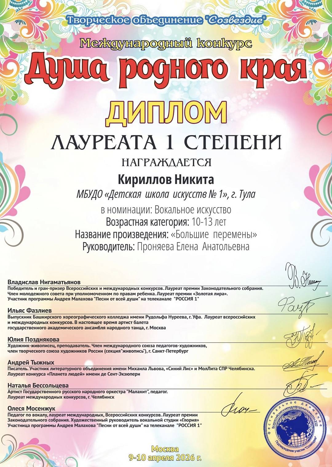 21 апреля 2026, Вторник 12:04 Просмотров: 3Поздравляем победителей Международного конкурса «Душа родного края» учащихся преподавателя Проняевой Елены Анатольевны:
