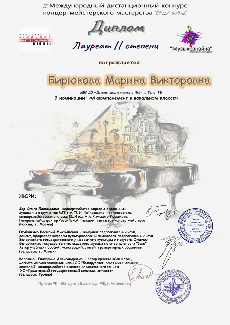 ПОЗДРАВЛЯЕМ концертмейстера нашей школы Марину Викторовну Бирюкову с высокими результатами на II Международном дистанционном конкурсе концертмейстерского мастерства «COLLA PARTE»