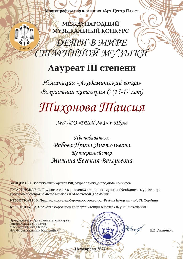 26 марта 2024, Вторник 07:03 Просмотров: 617Поздравляем Таисию Тихонову (преподаватель Ирина Анатольевна Рябова, концертмейстер Евгения Валерьевна Мишина) с Дипломом лауреата III степени Международного музыкального конкурса "Дети в мире старинной музыки"!