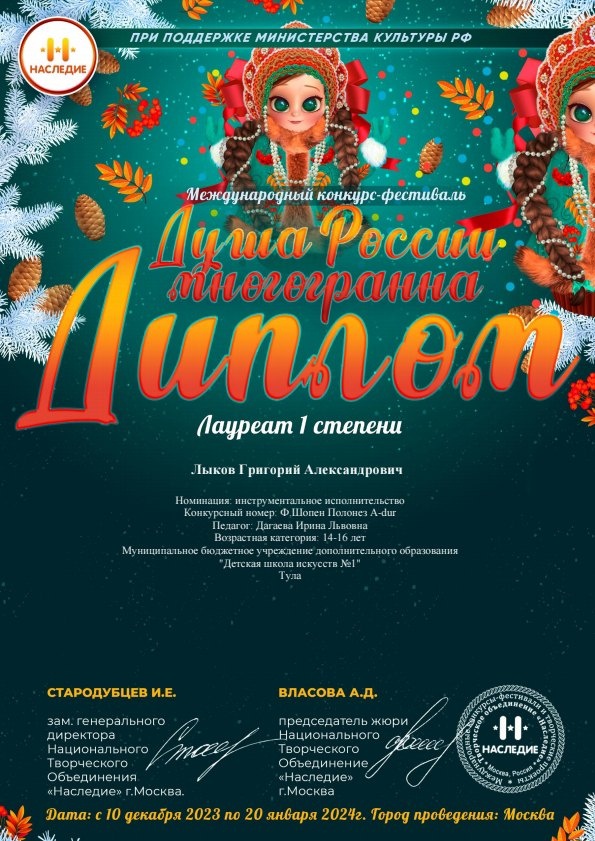 23 января 2024, Вторник 11:01 Просмотров: 709Поздравляем с ПОБЕДОЙ Григория Лыкова, преподаватель Ирина Львовна Дагаева! Диплом лауреата I степени Международного конкурса-фестиваля "Душа России многогранна". Желаем новых побед на конкурсах и фестивалях!