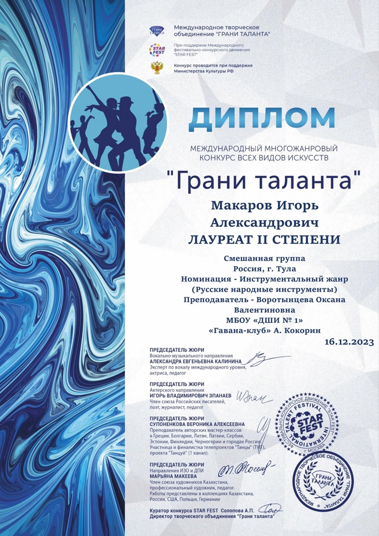 Поздравляем Игоря Макарова (преподаватель Оксана Валентиновна Воротынцева, концертмейстер Марина Викторовна Бирюкова) с Дипломом лауреата II степени Международного многожанрового конкурса всех видов искусств "Грани таланта"!