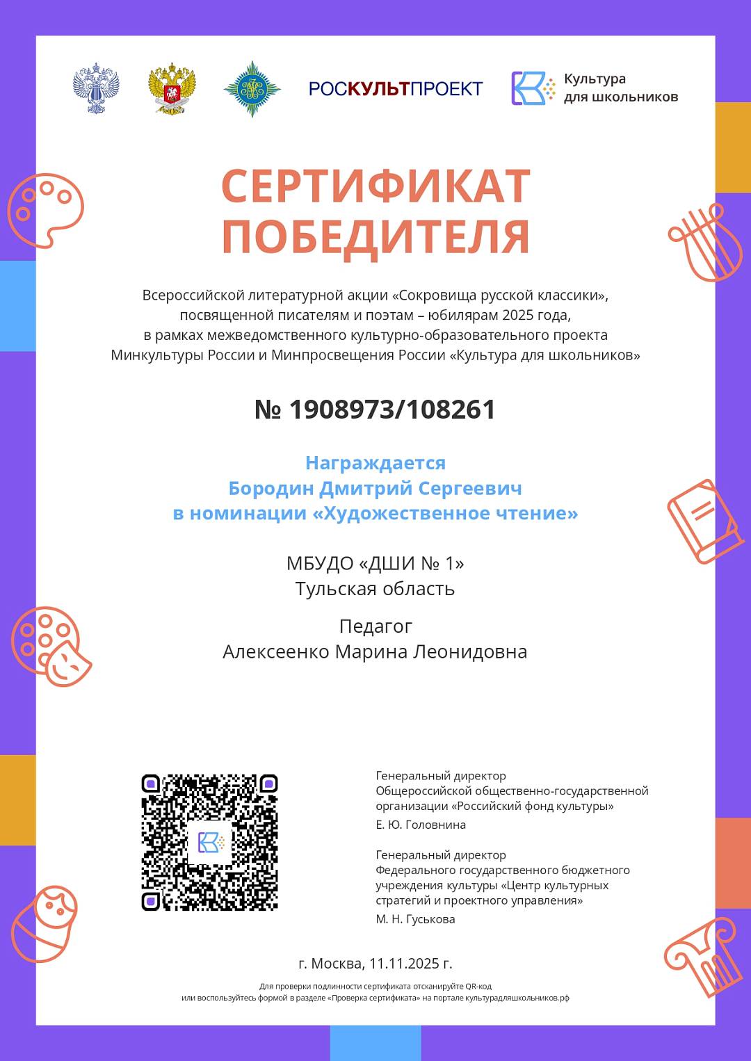 18 ноября 2025, Вторник 12:11 Просмотров: 135Подведены итоги всероссийской литературной акции «Сокровища русской классики», посвященной писателям и поэтам – юбилярам 2025 года. Экспертная комиссия выбрала более 100 лучших работ. В числе ПОБЕДИТЕЛЕЙ – солист Образцового коллектива ДМТ «Синяя птица» Дмитрий Бородин (преподаватель Марина Леонидовна Алексеенко).
