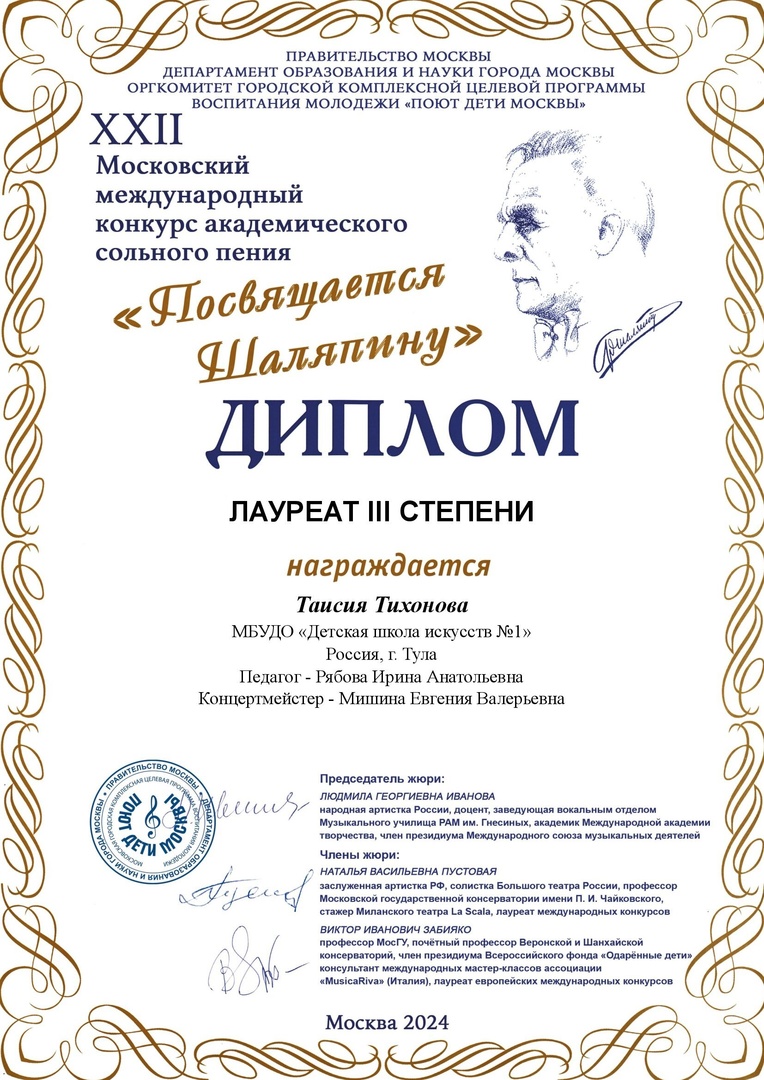 8 апреля 2024, Понедельник 04:04 Просмотров: 687Поздравляем Таисию Тихонову (преподаватель Ирина Анатольевна Рябова, концертмейстер Евгения Валерьевна Мишина) с Дипломом лауреата III степени XXII Московского международного конкурса академического сольного пения «Посвящается Шаляпину»