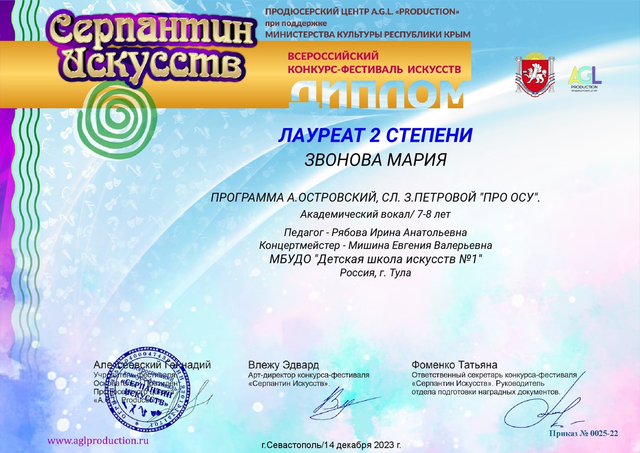 Мария Звонова – Диплом лауреата II степени.