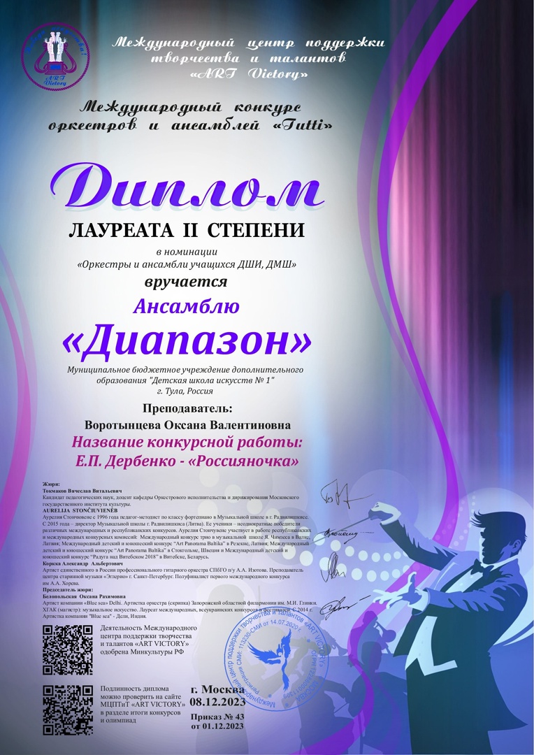 22 декабря 2023, Пятница 12:12 Просмотров: 705Поздравляем ансамбль «Диапазон» (Трунов Дмитрий, Кузьминов Владимир, Зардынова Алёна, Андреева Полина, Андреева София, Кочережников Иван, Мусаев Артём, Переведенцева Евгения, Макаров Игорь, Гераськина Елизавета) преподаватель Оксана Валентиновна Воротынцева, с Дипломом лауреата II степени Международного конкурса оркестров и ансамблей «Tutti». МОЛОДЦЫ! Вперёд, к новым ПОБЕДАМ!
