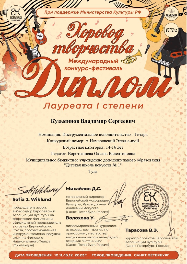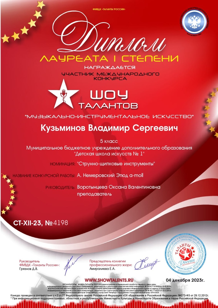 Поздравляем Владимира Кузьминова (преподаватель Оксана Валентиновна Воротынцева) с Дипломами лауреата I степени Международного конкурса-фестиваля "Хоровод творчества" и Международного конкурса "Шоу талантов"!