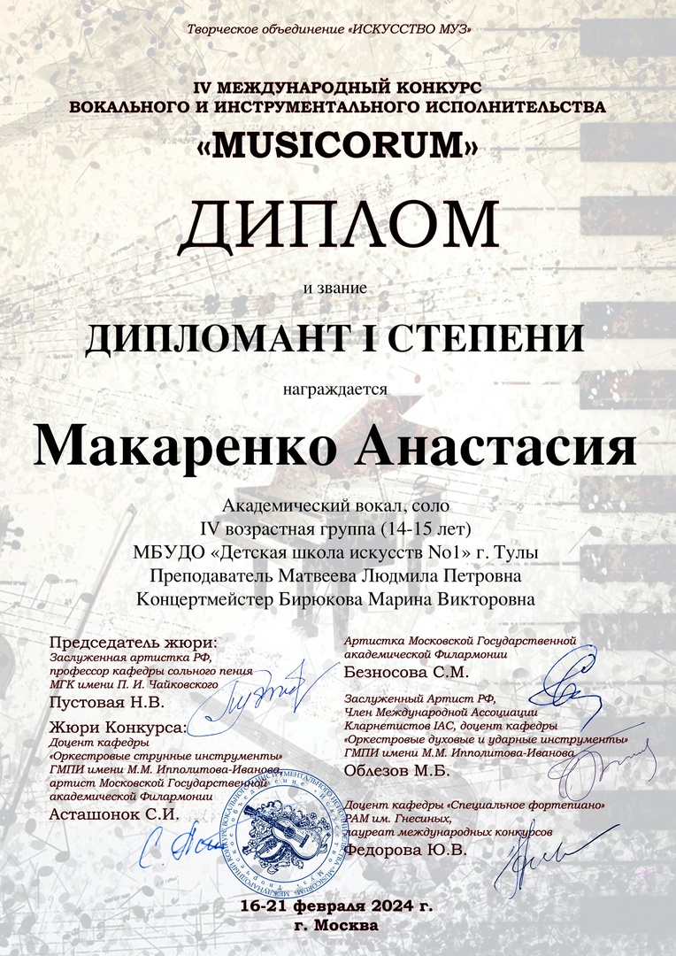инструментального исполнительства "MUSICORUM" Анастасию Макаренко