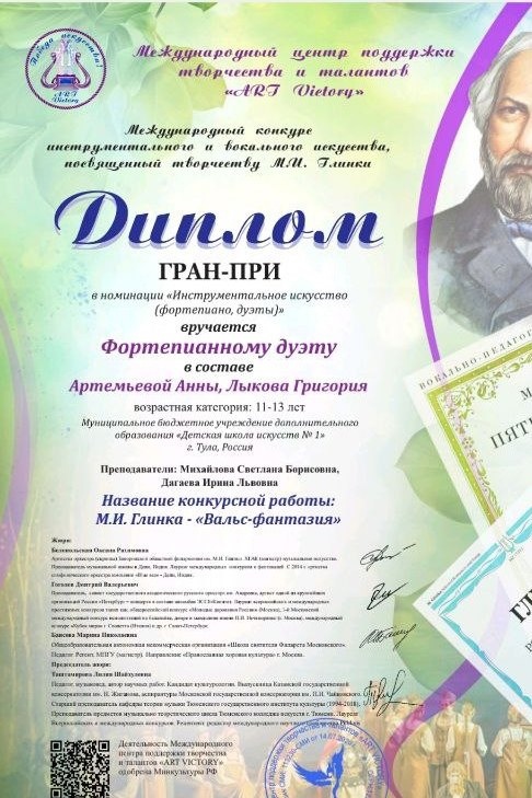 26 марта 2024, Вторник 07:03 Просмотров: 626ПОЗДРАВЛЯЕМ обладателей ГРАН-ПРИ Международного конкурса инструментального и вокального искусства, посвящённого творчеству М.И.Глинки Артемьеву Анну и Лыкова Григория ( преподаватели Михайлова Светлана Борисовна, Дагаева Ирина Львовна)!