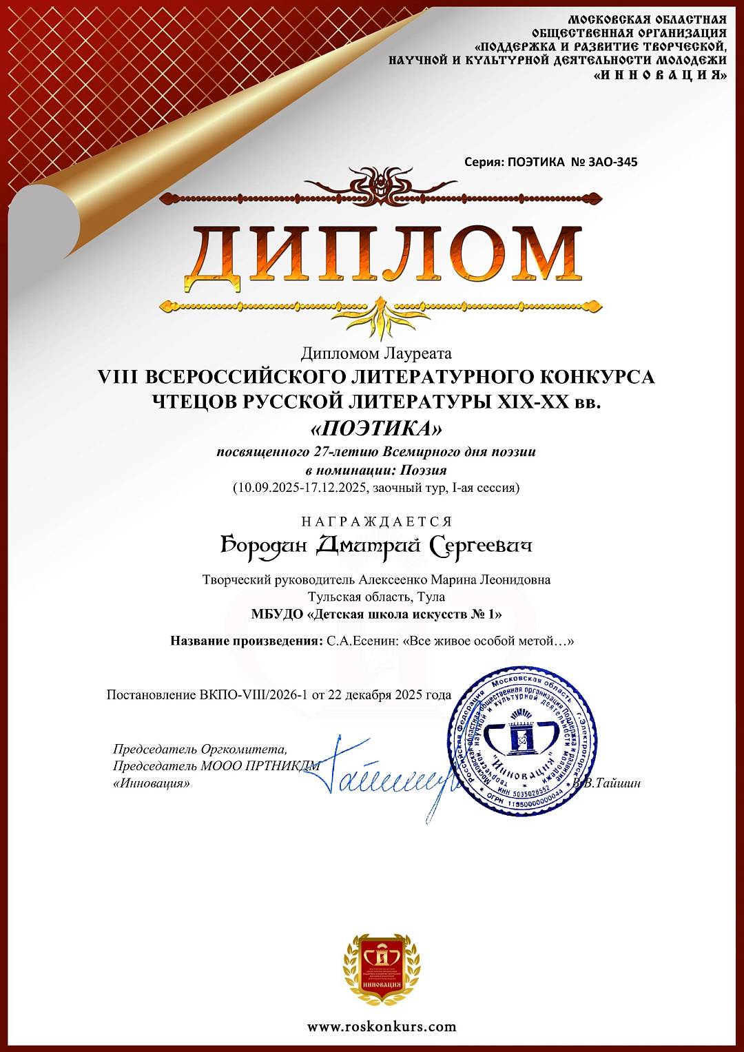 19 января 2026, Понедельник 12:01 Просмотров: 106Поздравляем Дмитрия Бородина (преподаватель Марина Леонидовна Алексеенко) - ЛАУРЕАТА VIII Всероссийского литературного конкурса чтецов русской литературы XIX-XX вв. «Поэтика», посвящённого 27-летию Всемирного дню поэзии, в номинации «Поэзия».