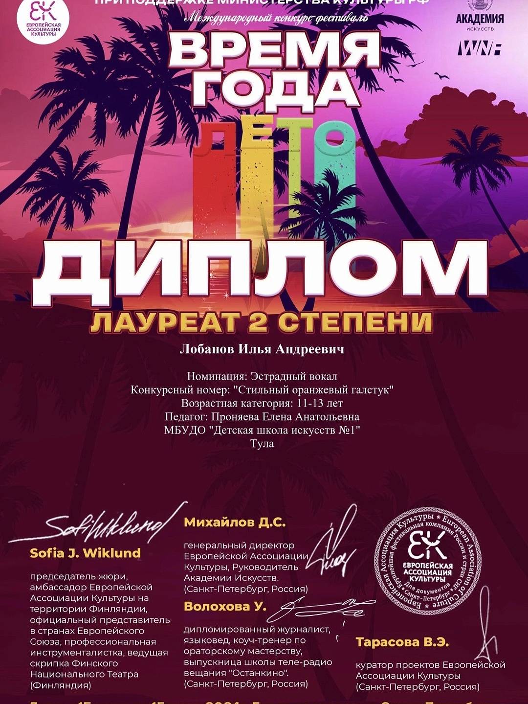 Поздравляем Илью Лобанова, с дипломом лауреата 2 степени Международного конкурса - фестиваля «Время года - лето»!