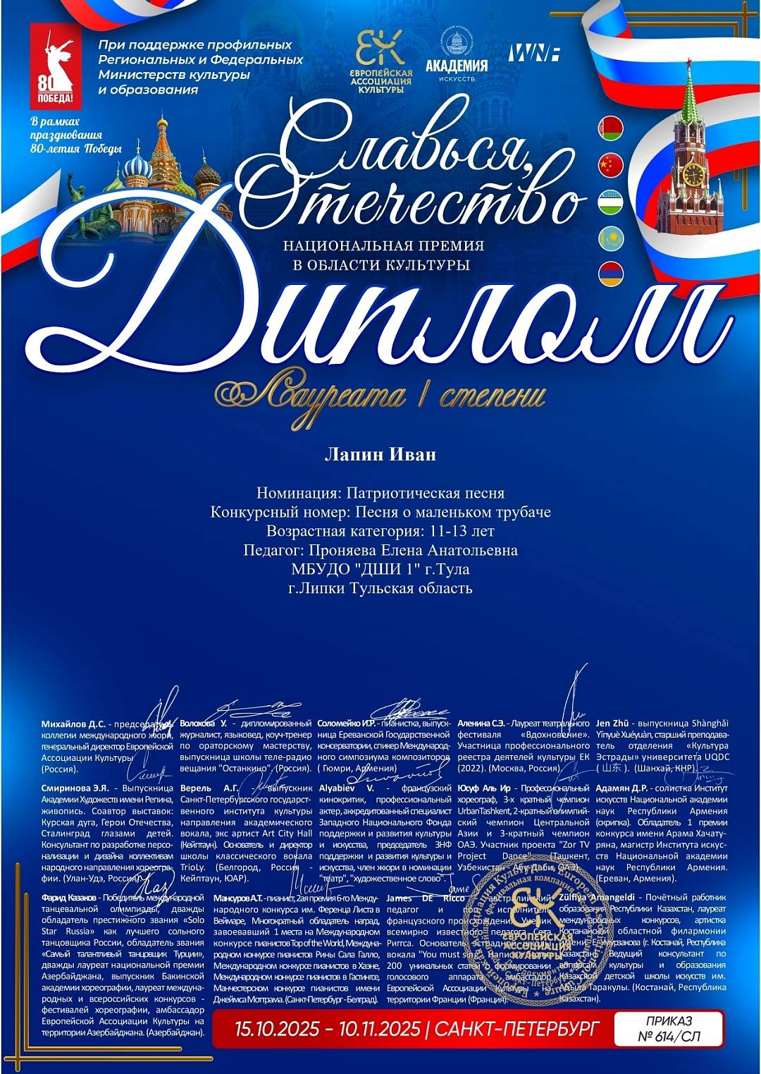 Поздравляем Ивана Лапина (преподаватель Елена Анатольевна Проняева) с Дипломом лауреата 1 степени Национальной Премии в области культуры "Славься, Отечество!"