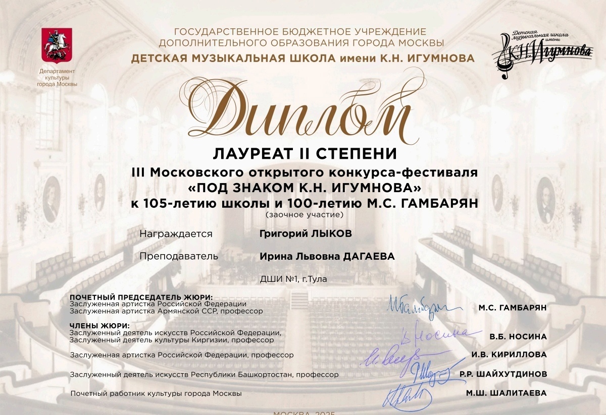 ПОЗДРАВЛЯЕМ лауреата 2 степени III Открытого московского конкурса- фестиваля "Под знаком К.Н.Игумнова" Лыкова Григория