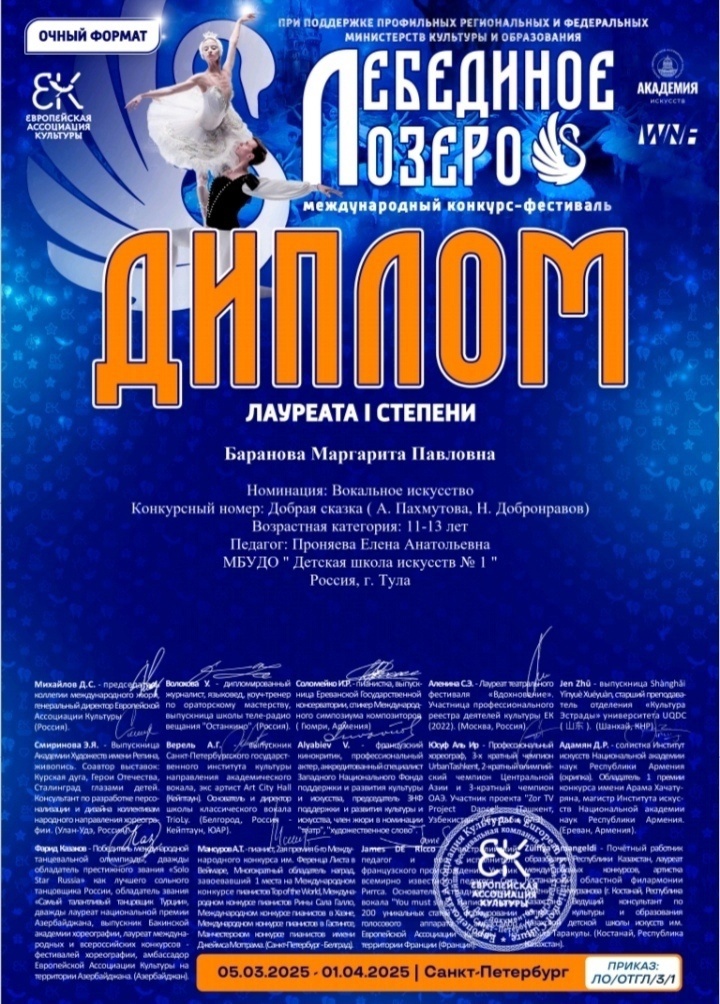 Поздравляем Маргариту Баранову с Дипломом лауреата 1 степени Международного конкурса- фестиваля «Лебединое озеро»!