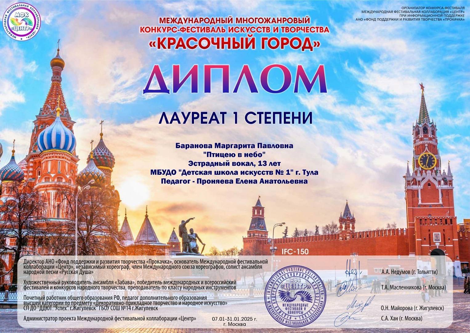Поздравляем Маргариту Баранову с Дипломом лауреата 1 степени Международного многожанрового конкурса -фестиваля искусств и творчества «Красочный город»!