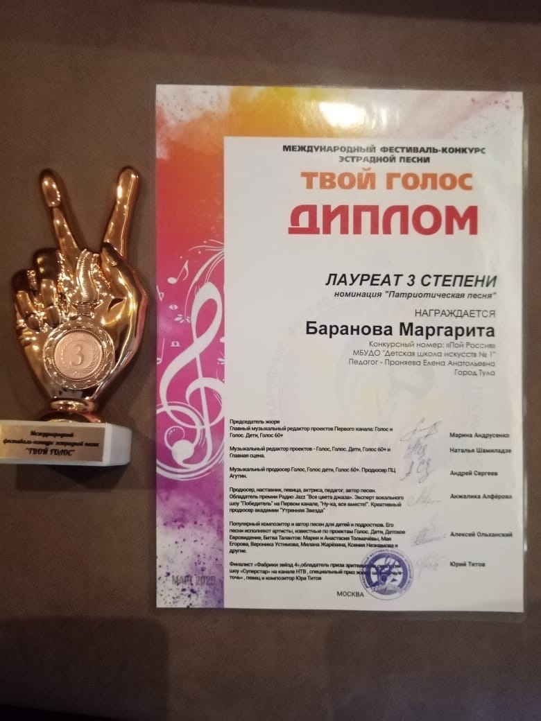 Поздравляем Маргариту Баранову с достойной наградой-Дипломом лауреата 3 степени Международного фестиваля-конкурса эстрадной песни «Твой голос»!