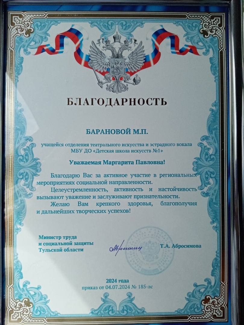 Благодарности Министра труда и социальной защиты Тульской области!