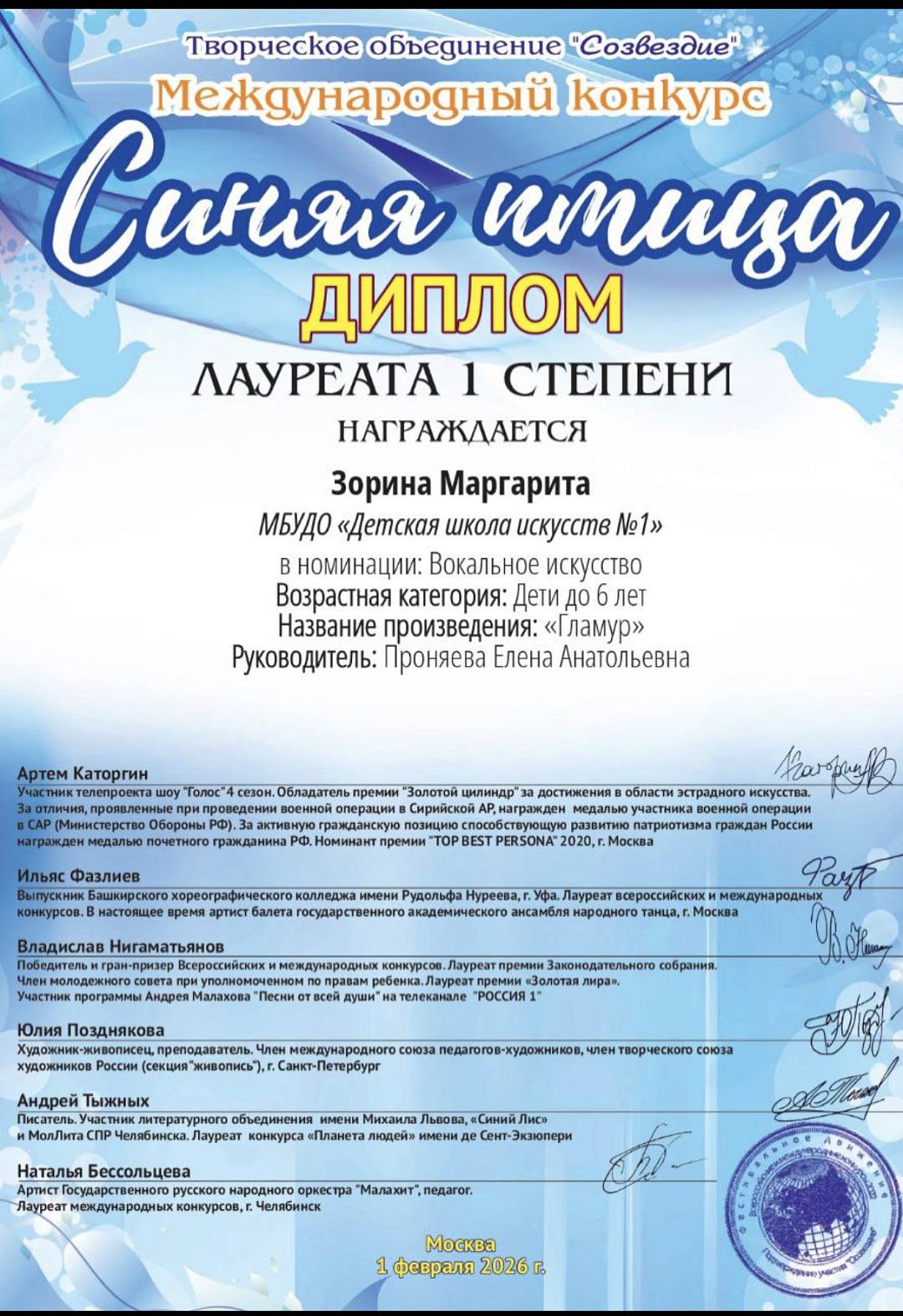 3 февраля 2026, Вторник 12:02 Просмотров: 86Поздравляем Маргариту и Софию Зориных (преподаватель Проняева Елена Анатольевна) с победой (Дипломы лауреата I степени) на Международном конкурсе «Синяя птица»!