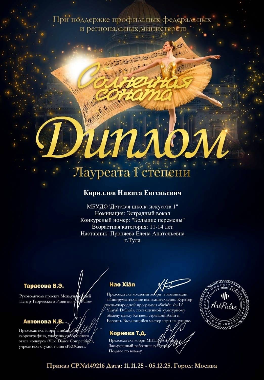 Поздравляем Никиту Кириллова с Дипломом лауреата 1 степени Международного конкурса «Солнечная соната»!