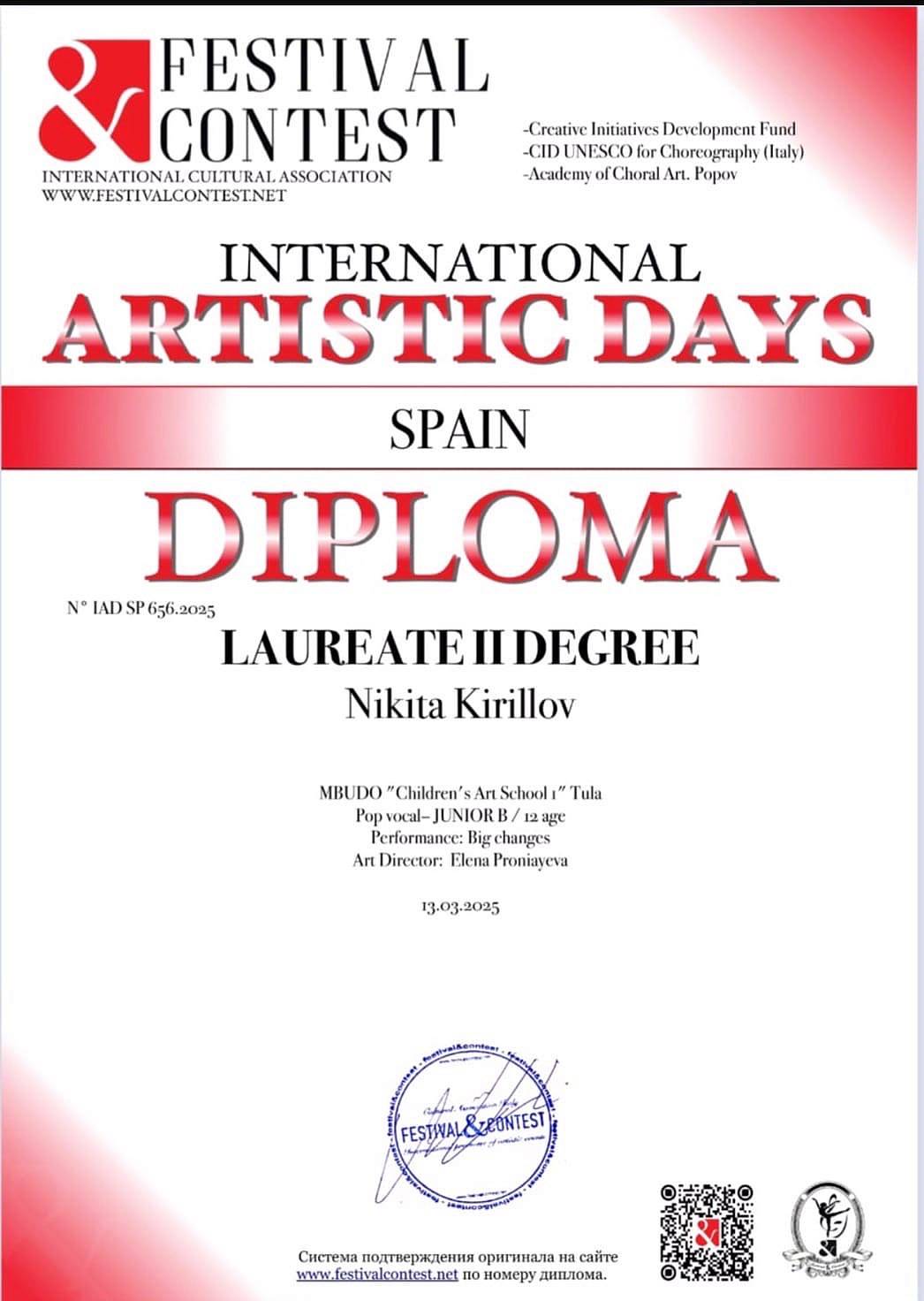 Поздравляем Никиту Кириллова с Дипломом лауреата 2 степени Международного заочного Фестиваля-Конкурса “INTERNATIONAL ARTISTIC DAYS IN SPAIN” 2025г