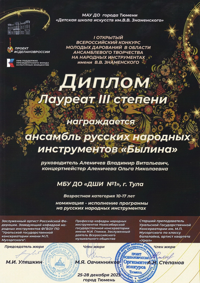 Поздравляем ПОБЕДИТЕЛЕЙ - Диплом лауреата III степени I Открытого Всероссийского конкурса молодых дарований в области ансамблевого творчества на народных инструментах имени В.В. Знаменского (г. Тюмень) ансамбль русских народных инструментов "Былина" (Иван Ермарченко, Андрей Еремеев, Иван Губарь, Радомир Родин), преп. Владимир Витальевич Аленичев, концертмейстер Ольга Николаевна Аленичева.