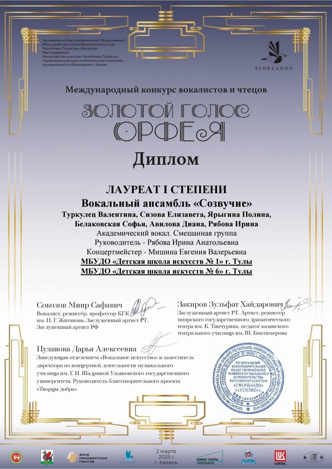 17 марта 2025, Понедельник 12:03 Просмотров: 499Поздравляем ПОБЕДИТЕЛЕЙ (Диплом лауреата I степени) Международного конкурса вокалистов и чтецов «Золотой голос Орфея» вокальный ансамбль «Созвучие» (Валентина Туркулец, Елизавета Сизова, Полина Ярыгина, Софья Белаковская, Диана Валерьевна Авилова, Ирина Анатольевна Рябова), руководитель Ирина Анатольевна Рябова, концертмейстер Евгения Валерьевна Мишина.