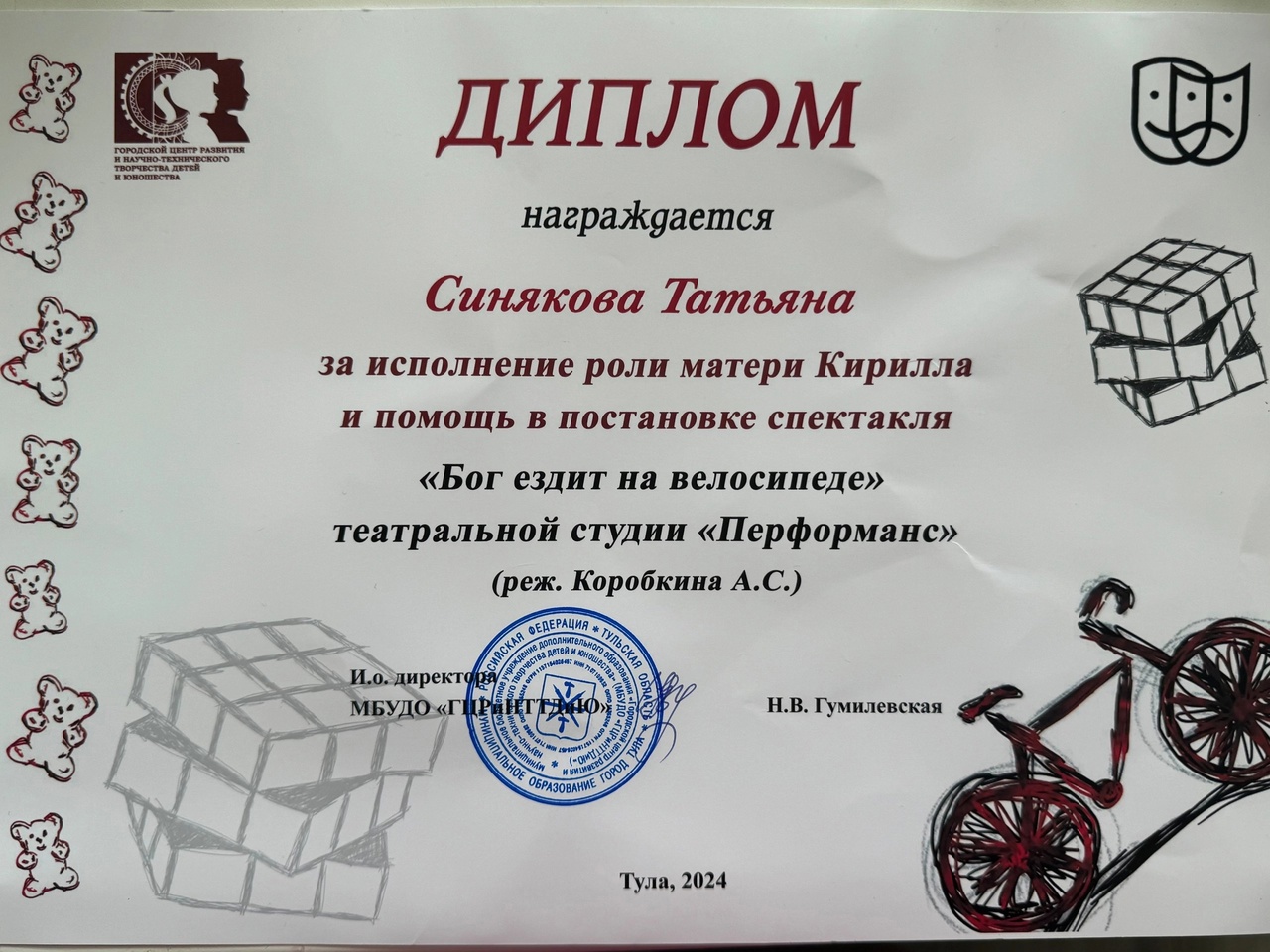 нашей школы Татьяну Владимировну Синякову с участием в спектакле "Бог