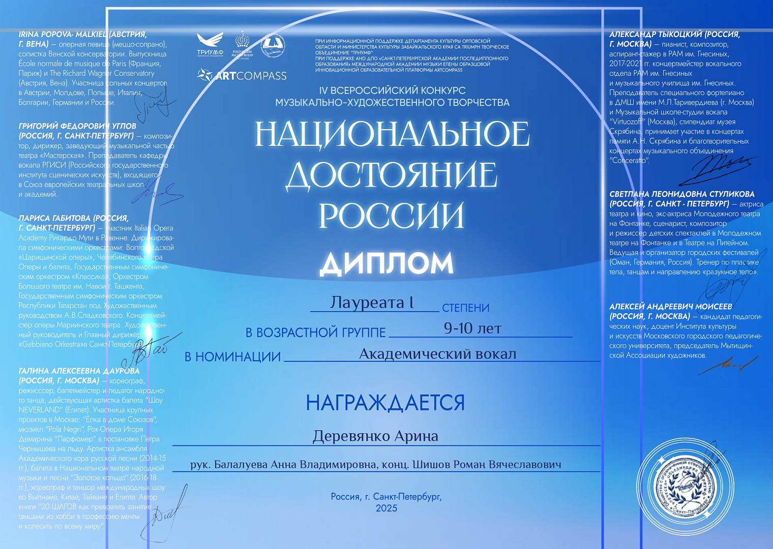 Поздравляем с ПОБЕДОЙ (Диплом лауреата I степени) IV Всероссийского конкурса музыкально-художественного творчества "Национальное достояние России" Арину Деревянко (преп. Балалуева Анна Владимировна, конц. Шишов Роман Вячеславович).